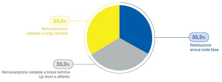La remunerazione dell’Amministratore Delegato è composta da una componente fissa, una componente variabile di breve termine e una componente variabile di lungo termine. In particolare, con riferimento ai sistemi di incentivazione variabile, l'importo maturabile potrà essere, quindi, al massimo pari a circa il 71,71% dei compensi lordi fissi per il sistema a breve termine, e pari a circa il 128,29% dei compensi lordi fissi per il sistema a lungo termine, in continuità con gli ultimi anni.